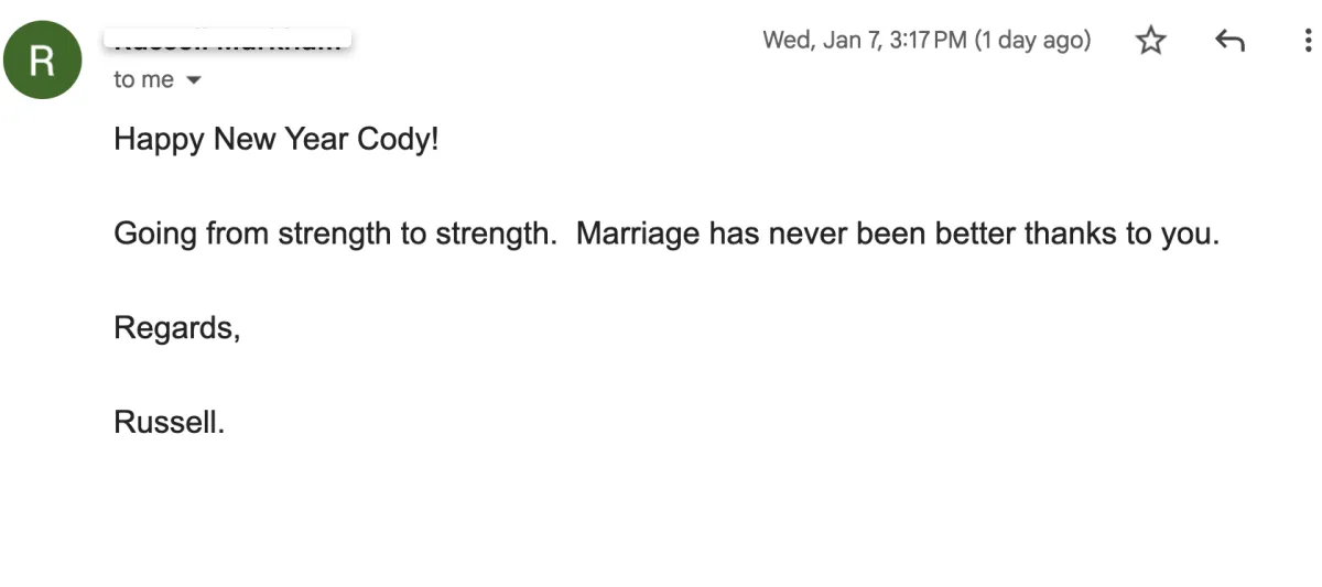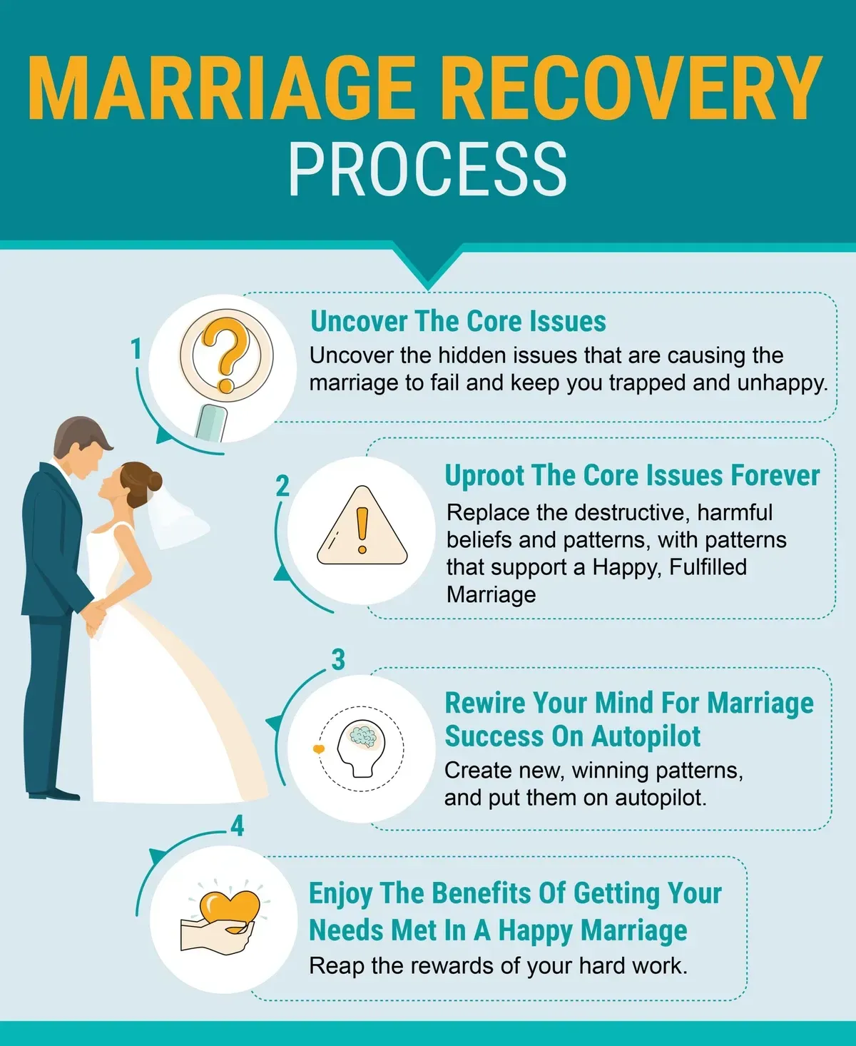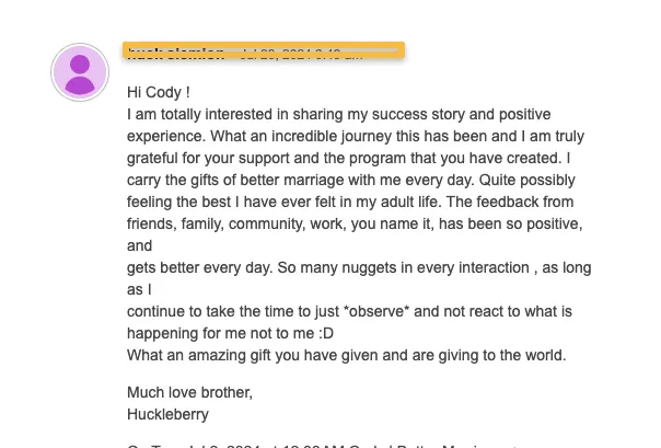 A. We are about creating a compelling future, NOT discussing the problems from the past. Therapy doesn’t work. Don’t believe me? Do a Google search for “Marriage Therapy Success Rates”. You will quickly see I’m telling the truth. After therapy, you will feel good for a while, you might even see some improvement, but 6 months later, you’ll be in the same place you are right now, or worse. What we do is permenent.